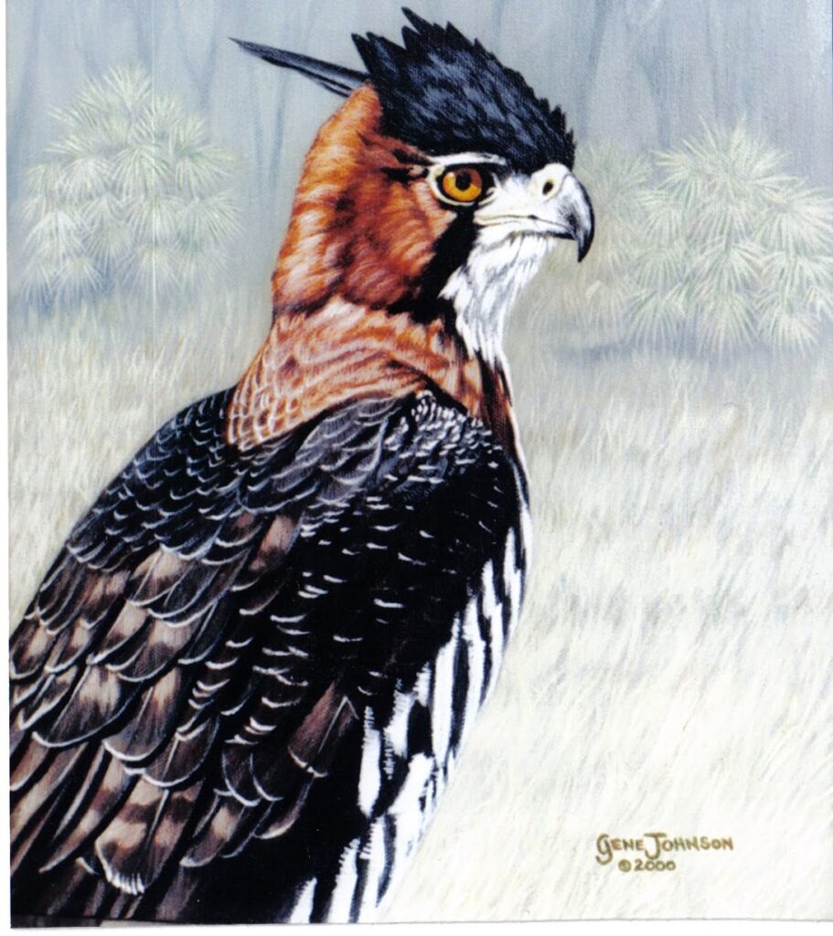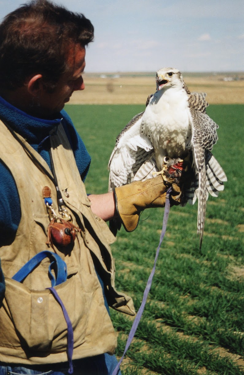 That reminded me of my falconer friend, Hal Webster, who trained falcons much of his life and is one of the most published authors on the subject. He also trained falcons for flight with lures, kites, balloons, etc. The parents will catch small prey—like a dove—and begin flying past the cliff, trying to entice the young chick, which by this point is usually between 48 and 55 days old. They gradually stop feeding the chick, teasing it instead to encourage it to take flight. Once the fledglings finally launch into the air, a graceful aerial dance of food exchanges begins. As the young birds build muscle and confidence, the parents continually raise the challenge, pushing them to refine their skills. The falconers mimic this training process, now with drones, but they used to use balloons or kites to dangle the bait. He introduced me to Gene Johnson and several other amazing falconers. Gene was also quite the artist as you can see from one of his works below.