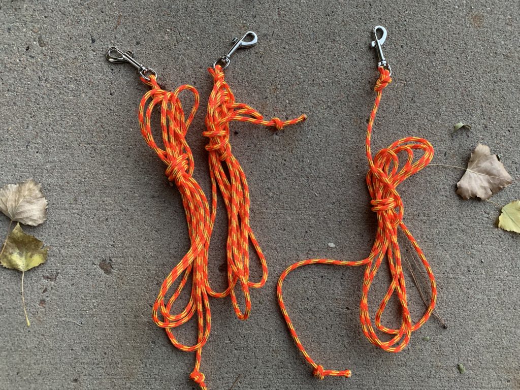 First thing that Jeff uses that is different is a puppy check cord. His are made from 8’ of nylon rope. I opted for orange Sterling Ropes 5mm Accessory Cord, which is better looking and not as burning on your hands. Tie off a swivel snap using a bowline knot. Jeff likes to put an over hand knot in the end of the rope. This is a lighter And shorter version of a drag check cord, great for puppies and which doubles as a leash.