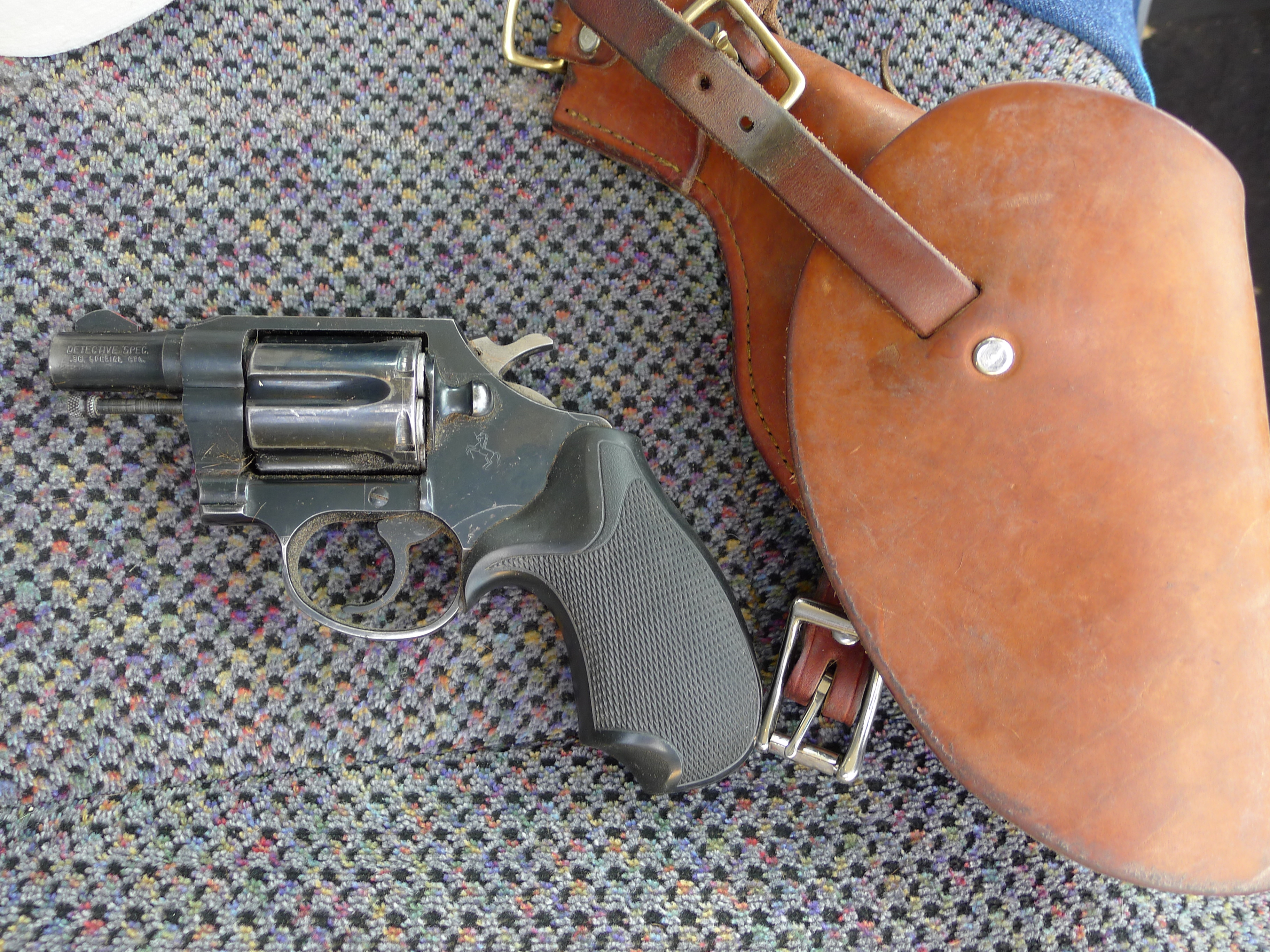 Ron had a .38 colt detective special, blued 3rd generation with pachmayer grips, and buckshot loads for snakes, but .45 ACP we got in the SW Governor may be even better as it also shoots .410 shells in addition to .45 ACP.